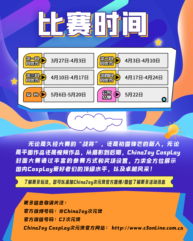 摘要: 在万众期待之中2024 ChinaJoy Cosplay 封面大赛现已开赛,各大奖项,等你角逐!华丽的评委阵容专业的评审标准使得本次大赛的评分水平全面无死角!评委名单2024 ChinaJoy 大赛各赛事赞助及合作王女士13910697624yvonne_wang@howellexpo.net让我们共同期待2024年ChinaJoy展会呈现给业界和广大玩家无限精彩!关于2024 ChinaJoy